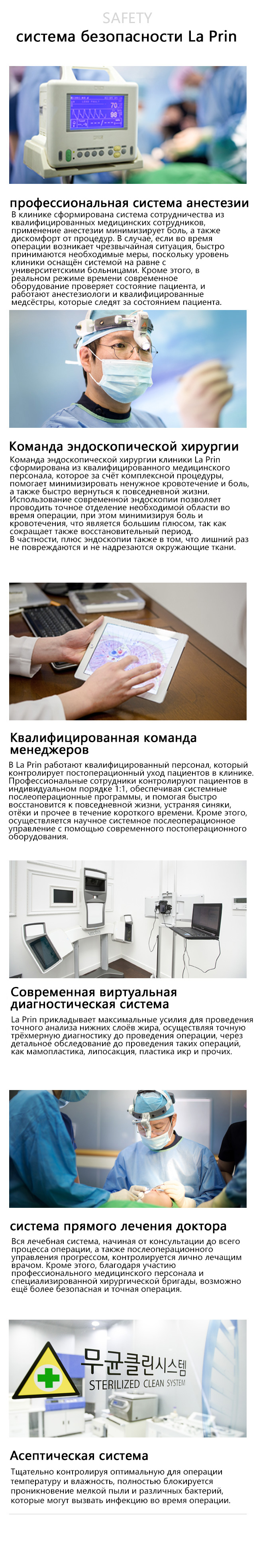 La Prin прикладывает максимальные усилия для проведения точного анализа нижних слоёв жира, осуществляя точную трёхмерную диагностику до проведения операции, через детальное обследование до проведения таких операций, как мамопластика, липосакция, пластика икр и прочих.