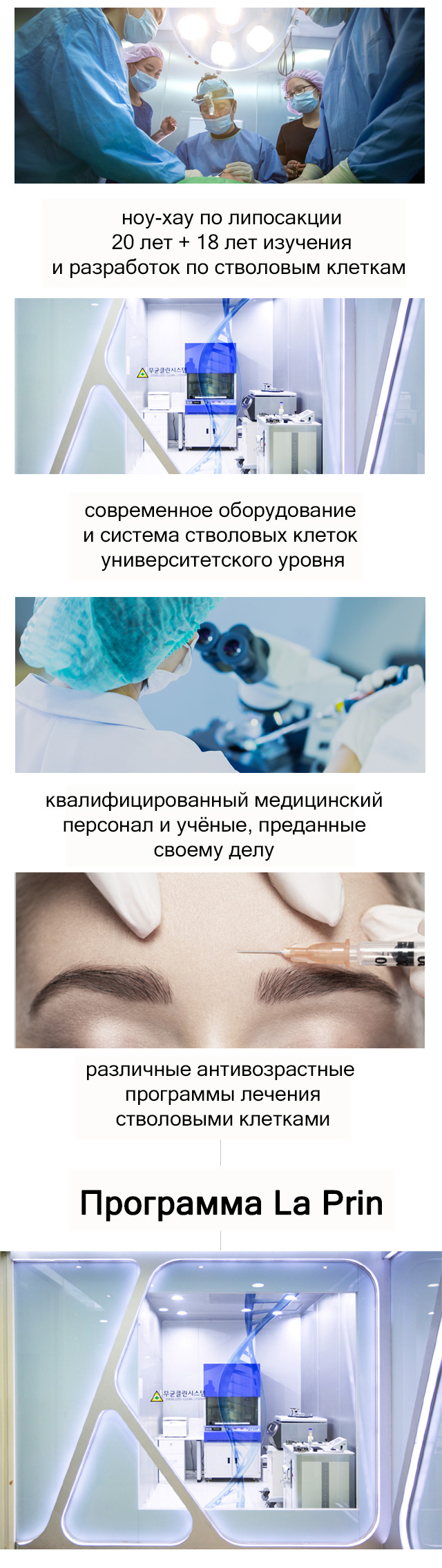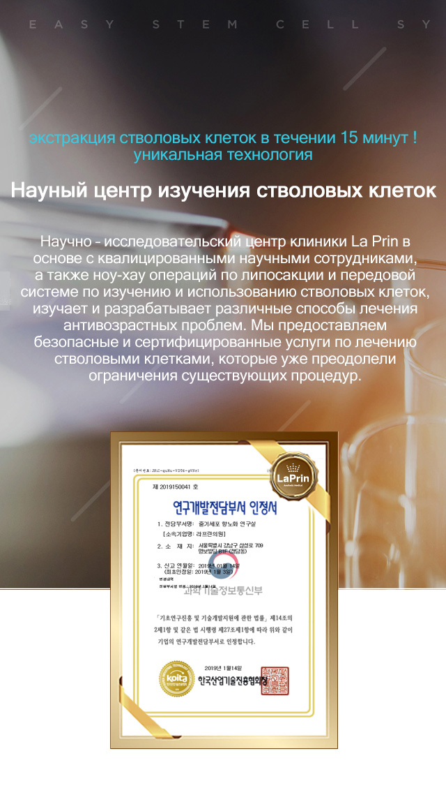 Научно – исследовательский центр клиники La Prin в основе с квалицированными научными сотрудниками, а также ноу-хау операций по липосакции и передовой системе по изучению и использованию стволовых клеток, изучает и разрабатывает различные способы лечения антивозрастных проблем. Мы предоставляем безопасные и сертифицированные услуги по лечению стволовыми клетками, которые уже преодолели ограничения существующих процедур.