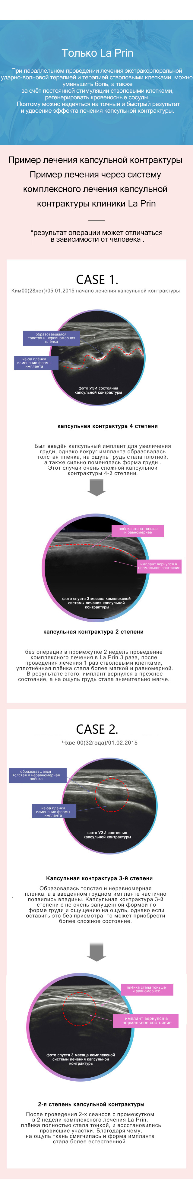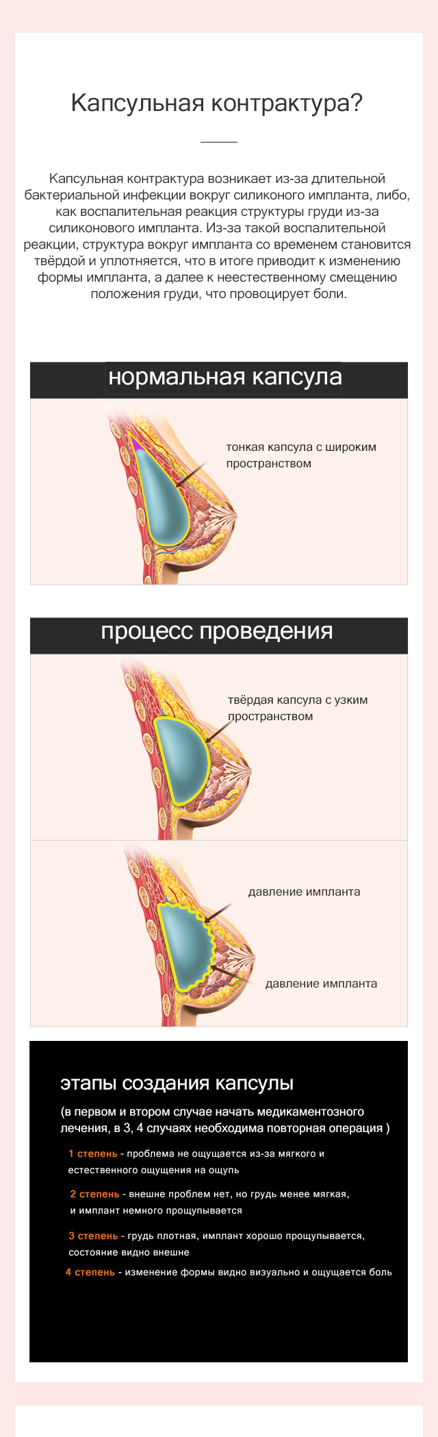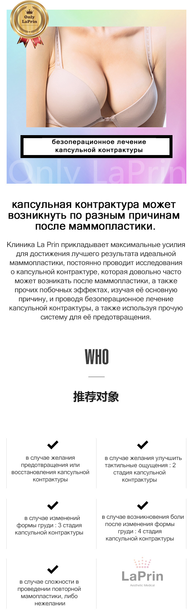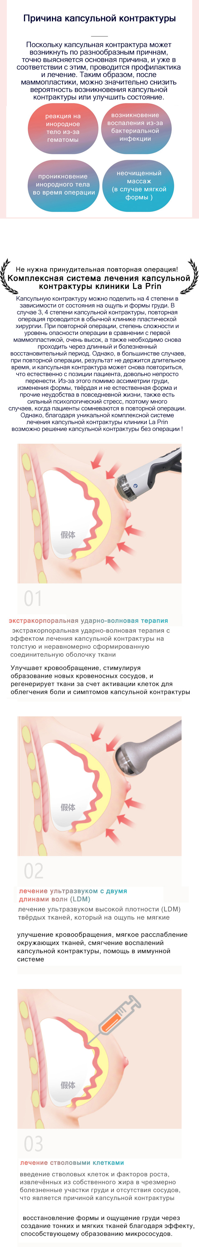 Комплексная система лечения капсульной контрактуры клиники La Prin Капсульную контрактуру можно поделить на 4 степени в зависимости от состояния на ощупь и формы груди. В случае 3, 4 степени капсульной контрактуры, повторная операция проводится в обычной клинике пластической хирургии. При повторной операции, степень сложности и уровень опасности операции в сравнении с первой маммопластикой, очень высок, а также необходимо снова проходить через длинный и болезненный восстановительный период. Однако, в большинстве случаев, при повторной операции, результат не держится длительное время, и капсульная контрактура может снова повториться, что естественно с позиции пациента, довольно непросто перенести. Из-за этого помимо ассиметрии груди, изменения формы, твёрдая и не естественная форма и прочие неудобства в повседневной жизни, также есть сильный психологический стресс, поэтому много случаев, когда пациенты сомневаются в повторной операции. Однако, благодаря уникальной комплексной системе лечения капсульной контрактуры клиники La Prin возможно решение капсульной контрактуры без операции !