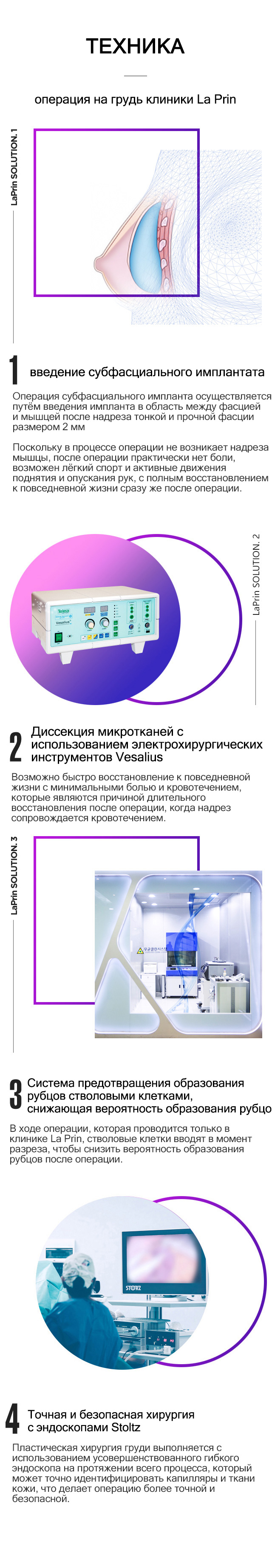 Пластическая хирургия груди выполняется с использованием усовершенствованного гибкого эндоскопа на протяжении всего процесса, который может точно идентифицировать капилляры и ткани кожи, что делает операцию более точной и безопасной.