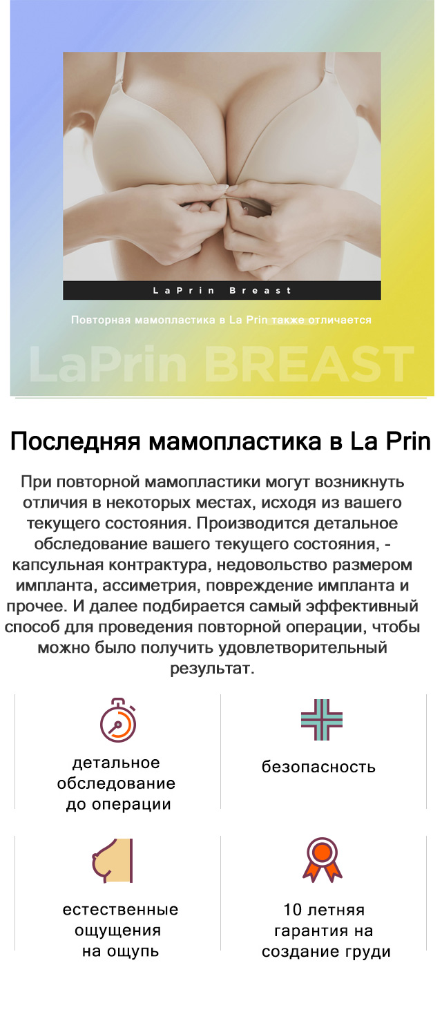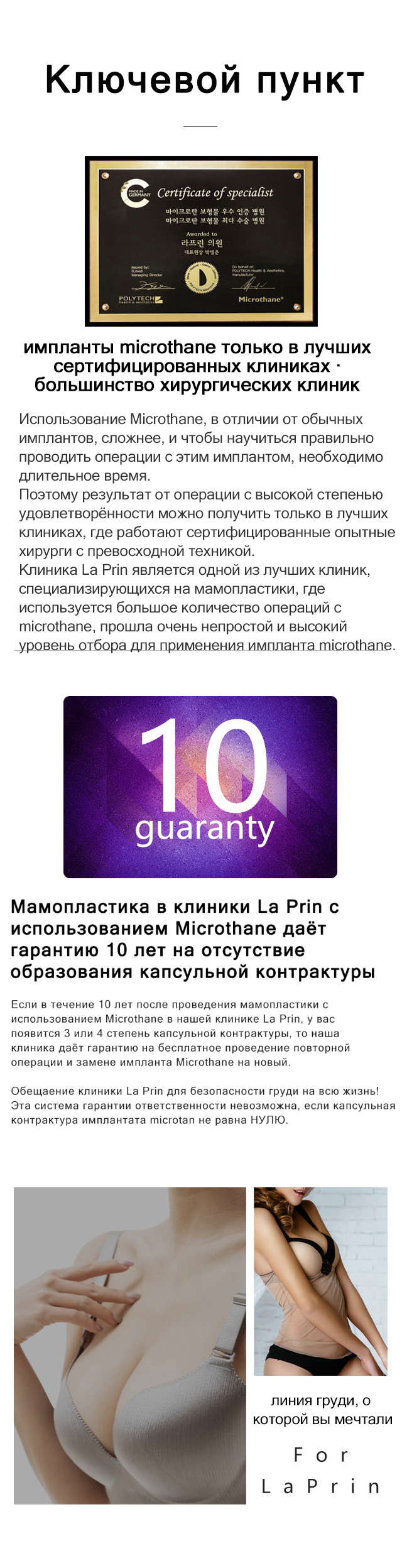 Если в течение 10 лет после проведения мамопластики с использованием Microthane в нашей клинике La Prin, у вас появится 3 или 4 степень капсульной контрактуры, то наша клиника даёт гарантию на бесплатное проведение повторной операции и замене импланта Microthane на новый. Обещаение клиники La Prin для безопасности груди на всю жизнь! Эта система гарантии ответственности невозможна, если капсульная контрактура имплантата microtan не равна НУЛЮ.