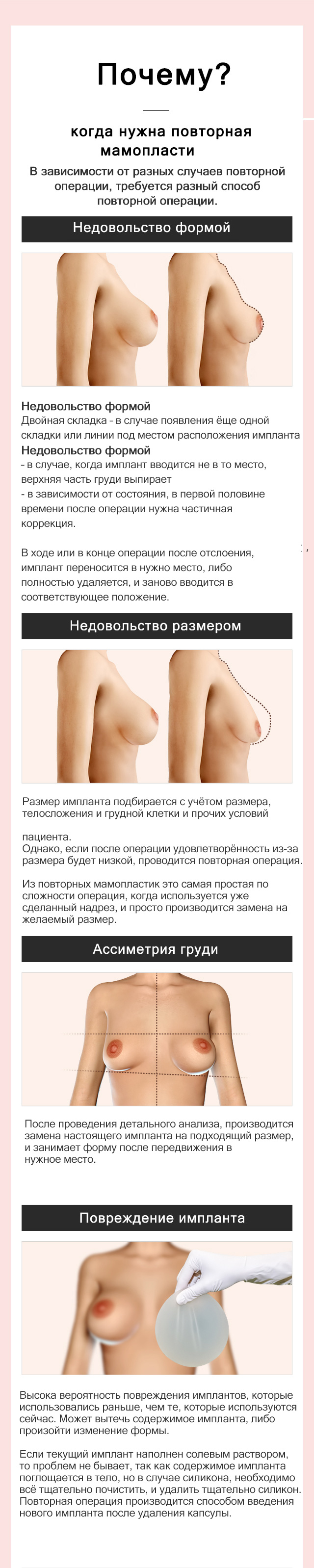 Из повторных мамопластик это самая простая по сложности операция, когда используется уже сделанный надрез, и просто производится замена на желаемый размер.
