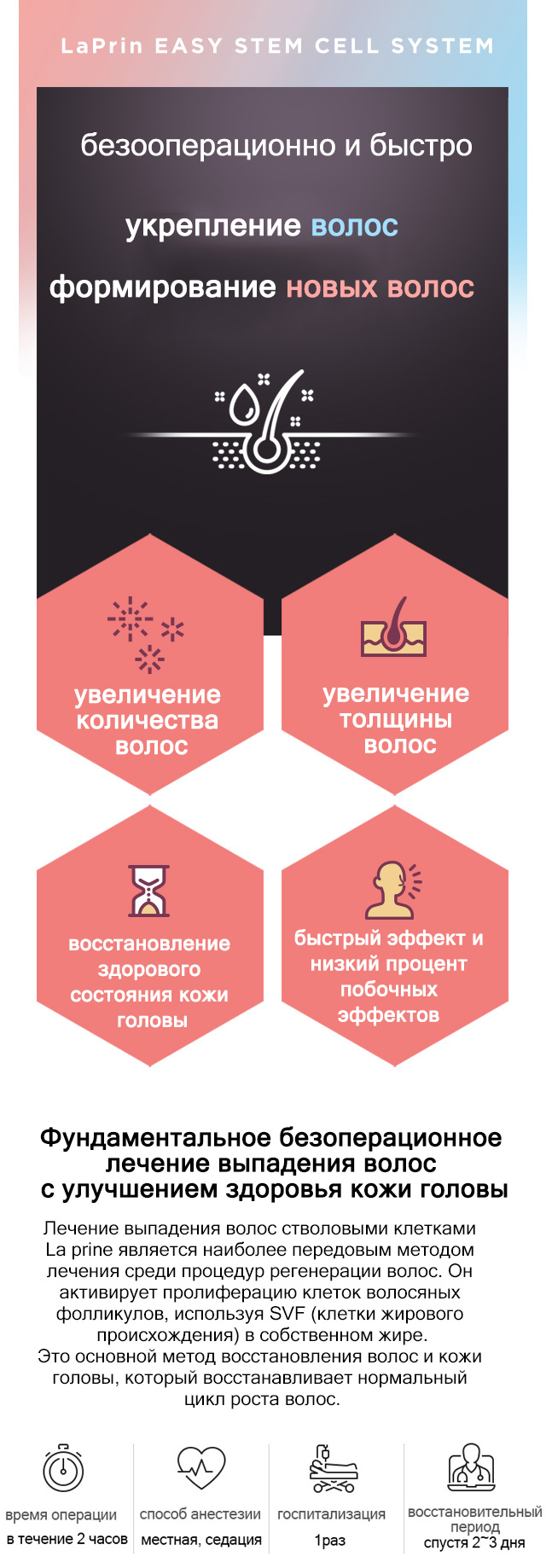 Лечение выпадения волос стволовыми клетками La prine является наиболее передовым методом лечения среди процедур регенерации волос. Он активирует пролиферацию клеток волосяных фолликулов, используя SVF (клетки жирового происхождения) в собственном жире.