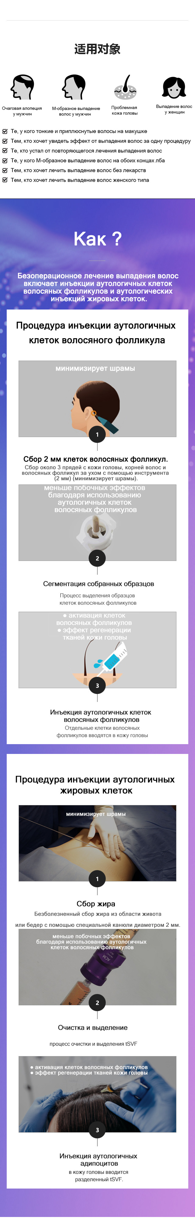 3. Инъекция аутологичных клеток волосяных фолликулов. Отдельные клетки волосяных фолликулов вводятся в кожу головы ( ● активация клеток волосяных фолликулов ● эффект регенерации тканей кожи головы)