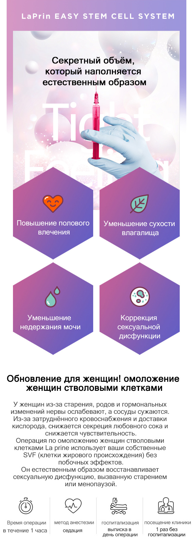 У женщин из-за старения, родов и гормональных изменений нервы ослабевают, а сосуды сужаются. Из-за затруднённого кровоснабжения и доставки кислорода, снижается секреция любовного сока и снижается чувствительность. Операция по омоложению женщин стволовыми клетками La prine использует ваши собственные SVF (клетки жирового происхождения) без побочных эффектов. Он естественным образом восстанавливает сексуальную дисфункцию, вызванную старением или менопаузой.