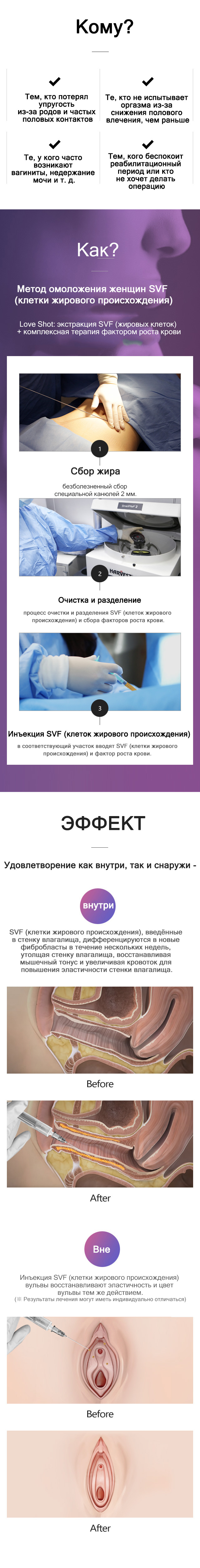 внутри SVF (клетки жирового происхождения), введённые в стенку влагалища, дифференцируются в новые фибробласты в течение нескольких недель, утолщая стенку влагалища, восстанавливая мышечный тонус и увеличивая кровоток для повышения эластичности стенки влагалища. (※ Результаты могут индивидуально отличаться)