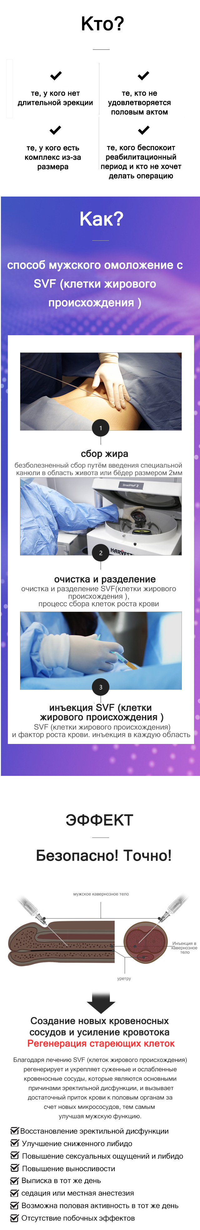 Благодаря лечению SVF (клеток жирового происхождения) регенерирует и укрепляет суженные и ослабленные кровеносные сосуды, которые являются основными причинами эректильной дисфункции, и вызывает достаточный приток крови к половым органам за счет новых микрососудов, тем самым улучшая мужскую функцию.