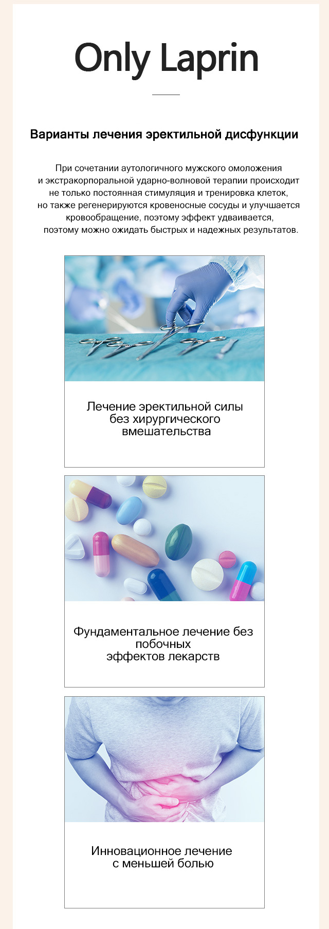 Восстановление эректильной дисфункции / Улучшение сниженного либидо / Повышение сексуальных ощущений и либидо / Повышение выносливости / Выписка в тот же день / седация или местная анестезия / Возможна половая активность в тот же день / Отсутствие побочных эффектов