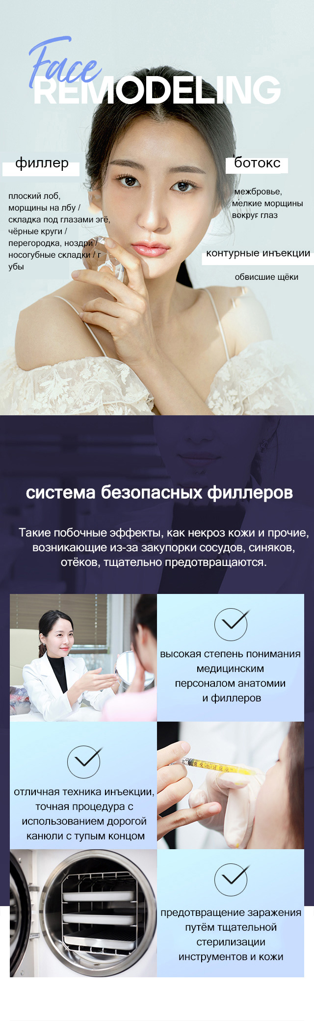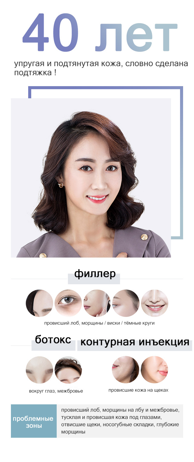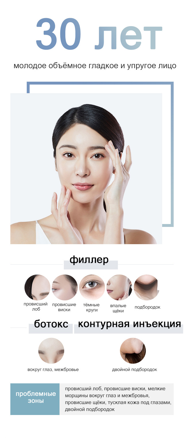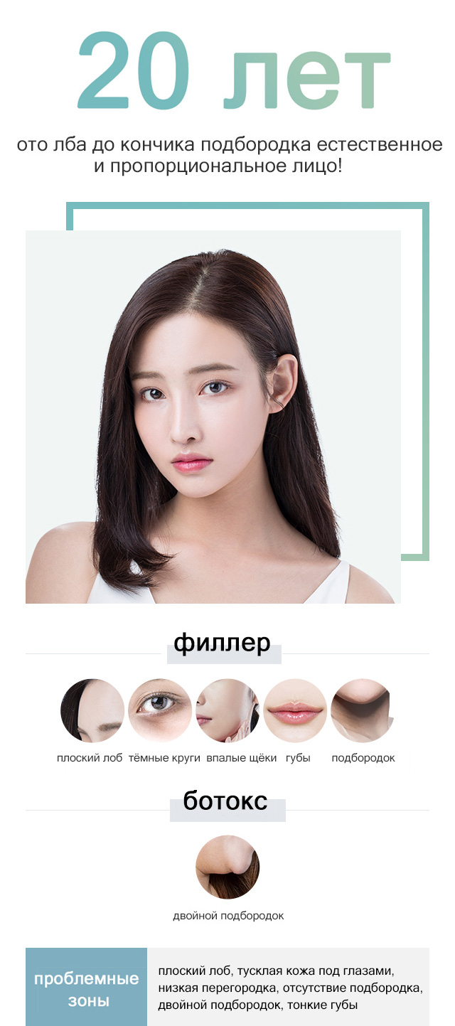 (филлер) плоский лоб, морщины на лбу / складка под глазами эгё, чёрные круги / перегородка, ноздри / носогубные складки / губы