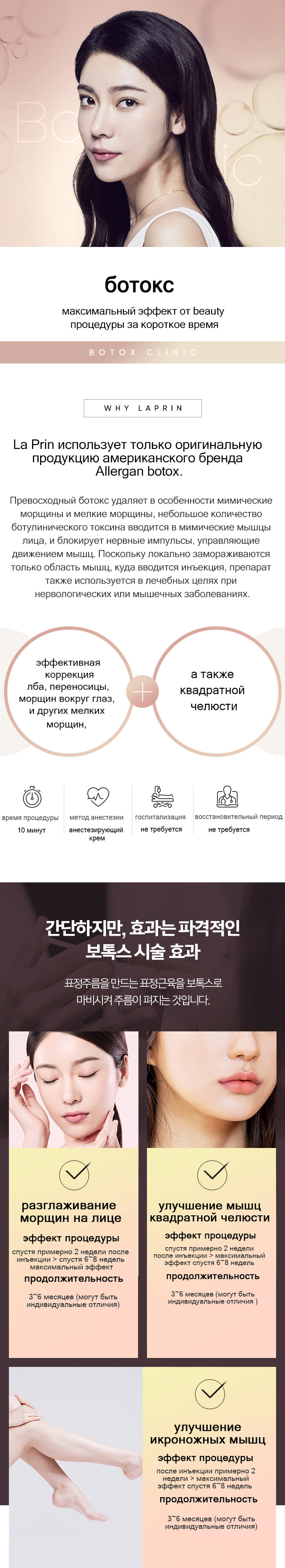 La Prin использует только оригинальную продукцию американского бренда Allergan botox. Превосходный ботокс удаляет в особенности мимические морщины и мелкие морщины, небольшое количество ботулинического токсина вводится в мимические мышцы лица, и блокирует нервные импульсы, управляющие движением мышц. Поскольку локально замораживаются только область мышц, куда вводится инъекция, препарат также используется в лечебных целях при нервологических или мышечных заболеваниях.