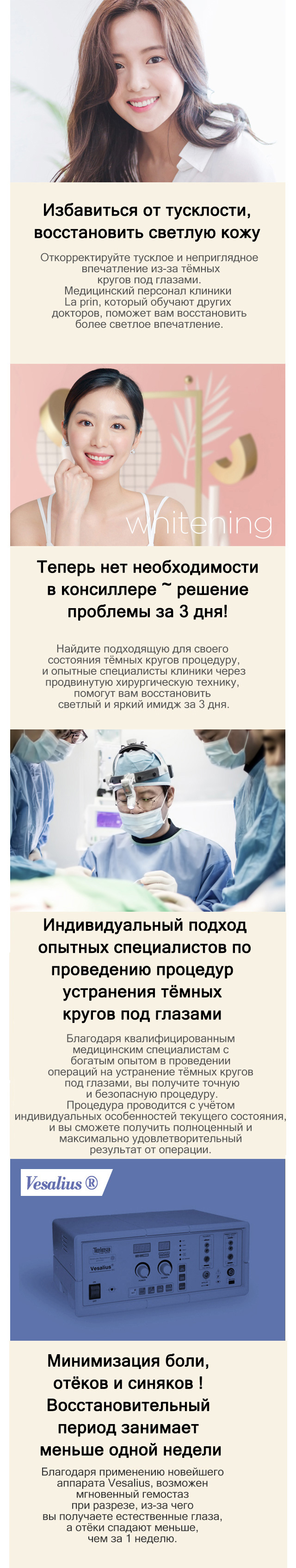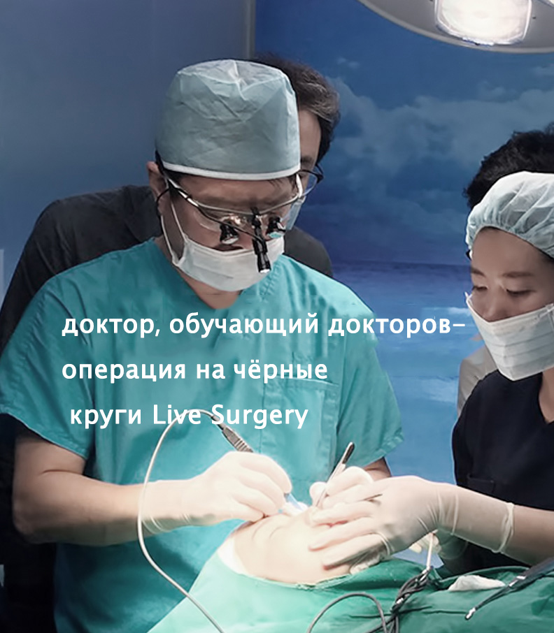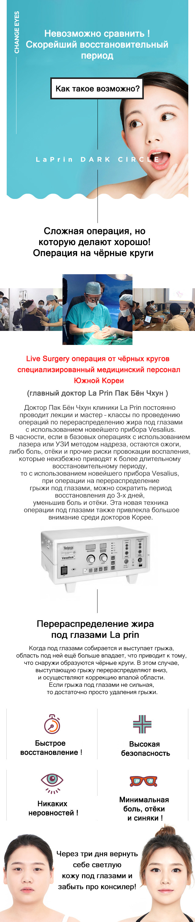 Live Surgery операция от чёрных кругов специализированный медицинский персонал Южной Кореи (главный доктор La Prin Пак Бён Чхун ) Доктор Пак Бён Чхун клиники La Prin постоянно проводит лекции и мастер – классы по проведению операций по перераспределению жира под глазами с использованием новейшего прибора Vesalius. В часности, если в базовых операциях с использованием лазера или УЗИ методом надреза, остаются ожоги, либо боль, отёки и прочие риски провокации воспаления, которые неизбежно приводят к более длительному восстановительному периоду, то с использованием новейшего прибора Vesalius, при операции на перераспределение грыжи под глазами, можно сократить период восстановления до 3-х дней, уменьшив боль и отёки. Эта новая техника операции под глазами также привлекла большое внимание среди докторов Корее.