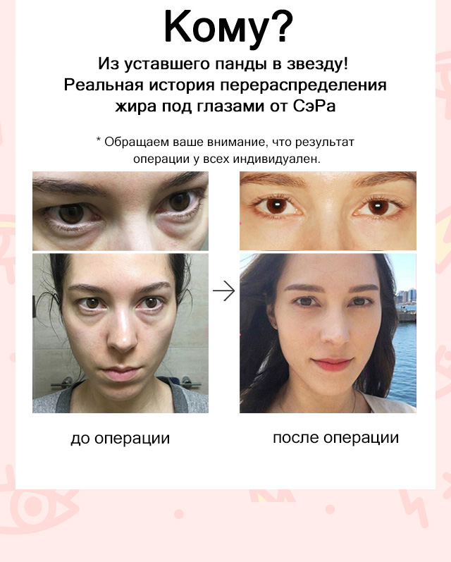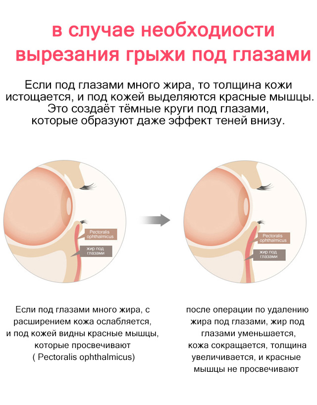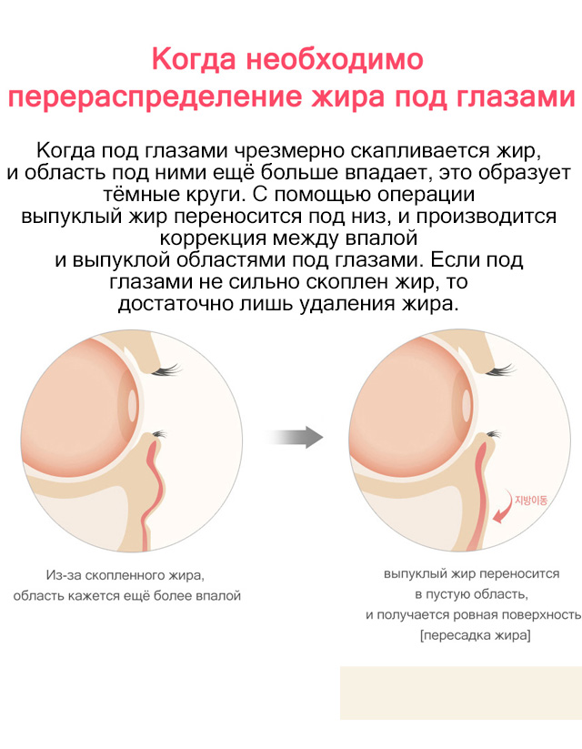 Когда под глазами чрезмерно скапливается жир, и область под ними ещё больше впадает, это образует тёмные круги. С помощью операции выпуклый жир переносится под низ, и производится коррекция между впалой и выпуклой областями под глазами. Если под глазами не сильно скоплен жир, то достаточно лишь удаления жира.