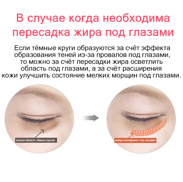 Если тёмные круги образуются за счёт эффекта образования теней из-за провалов под глазами, то можно за счёт пересадки жира осветлить область под глазами, а за счёт расширения кожи улучшить состояние мелких морщин под глазами. [впалая область тёмных кругов, микро липофилинг под глазами]