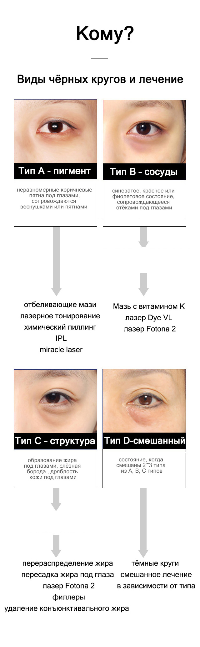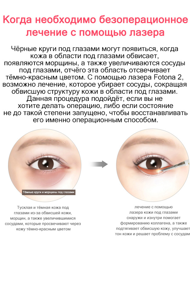 Чёрные круги под глазами могут появиться, когда кожа в области под глазами обвисает, появляются морщины, а также увеличиваются сосуды под глазами, отчёго эта область отсвечивает тёмно-красным цветом. С помощью лазера Fotona 2, возможно лечение, которое убирает сосуды, сокращая обвисшую структуру кожи в области под глазами. Данная процедура подойдёт, если вы не хотите делать операцию, либо если состояние не до такой степени запущено, чтобы восстанавливать его именно операционным способом. [Тёмные круги и морщины под глазами ] Тусклая и тёмная кожа под глазами из-за обвисшей кожи, морщин, а также увеличившимися сосудами, которые просвечивают через кожу тёмно-красным цветом > лечение с помощью лазера кожи под глазами снаружи и изнутри помогает формированию коллагена, а также подтягивает обвисшую кожу, улучшает тон кожи и решает проблему с сосудами