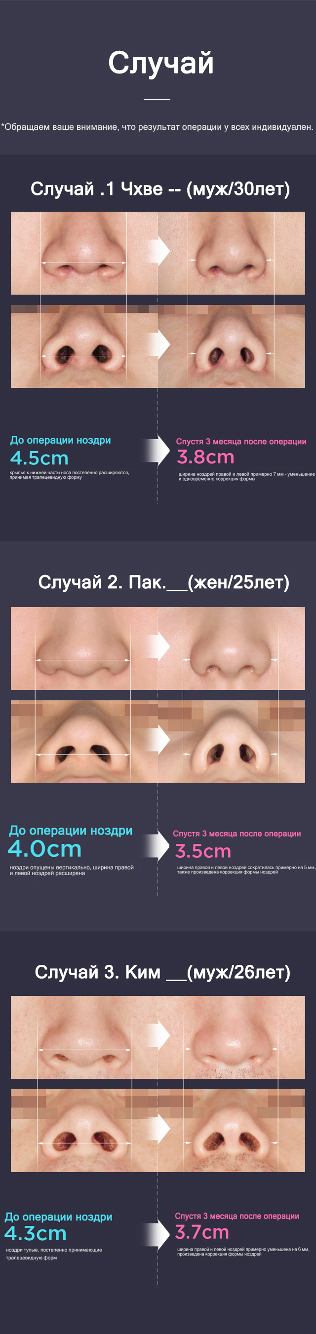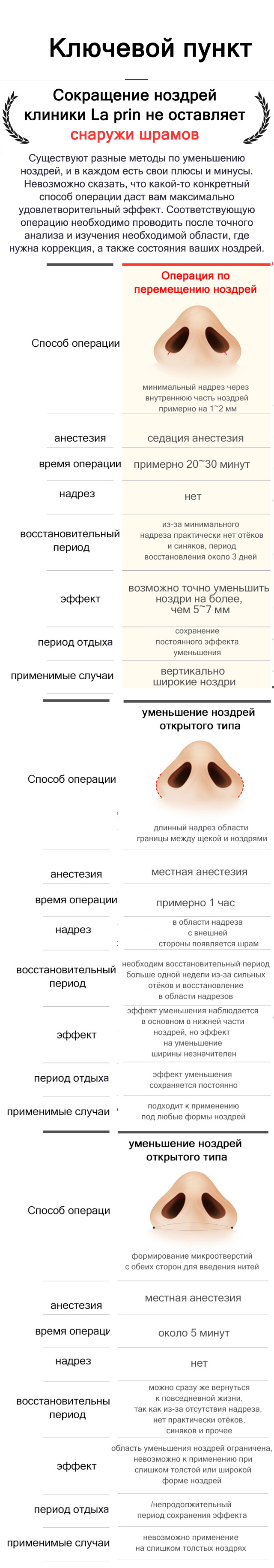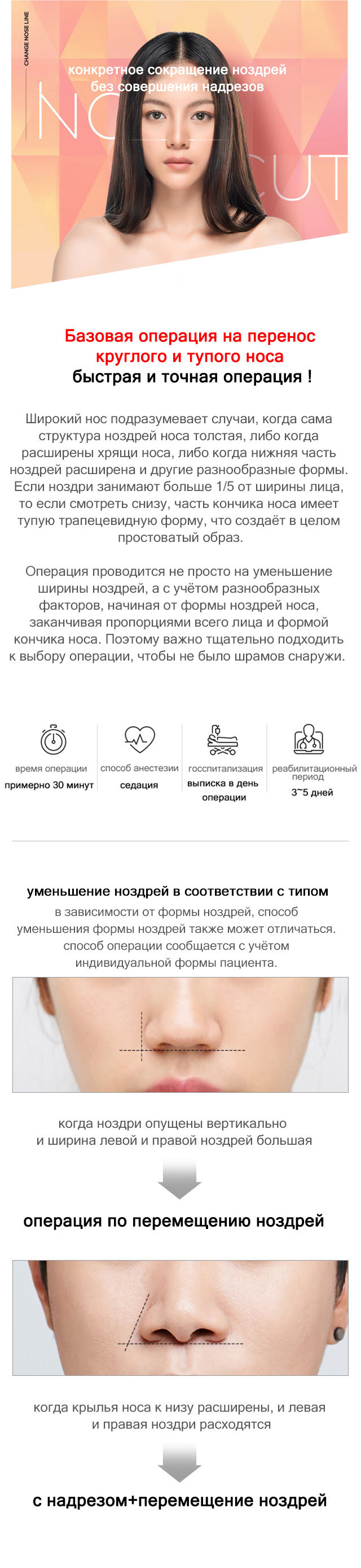 минимальный надрез через внутреннюю часть ноздрей примерно на 1~2 мм / седация анестезия / примерно 20~30 минут / нет / из-за минимального надреза практически нет отёков и синяков, период восстановления около 3 дней / возможно точно уменьшить ноздри на более, чем 5~7 мм / сохранение постоянного эффекта уменьшения / вертикально широкие ноздри
