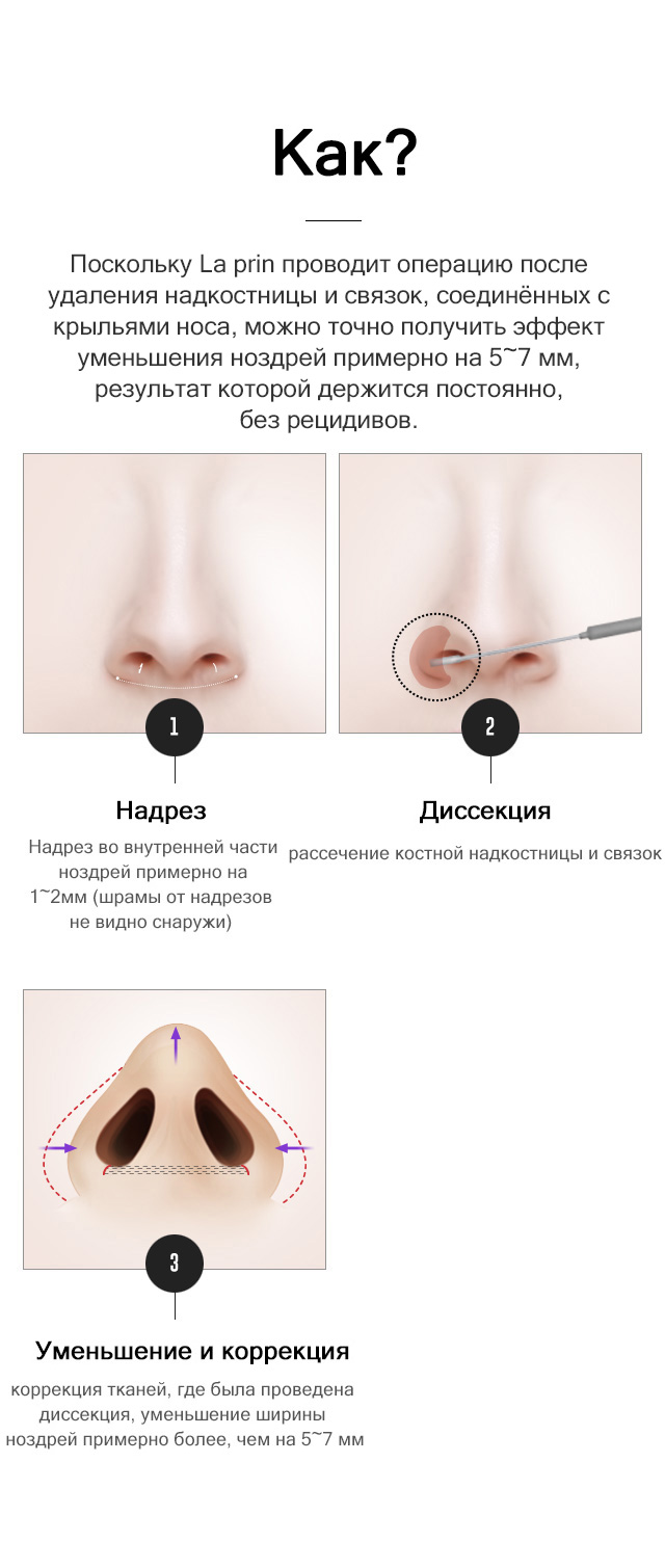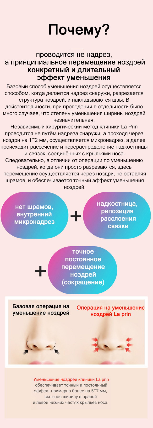 Базовый способ уменьшения ноздрей осуществляется способом, когда делается надрез снаружи, разрезается структура ноздрей, и накладываются швы. В действительности, при проведении в отдельности было много случаев, что степень уменьшения ширины ноздрей незначительная. Независимый хирургический метод клиники La Prin проводится не путём надреза снаружи, а проходя через ноздри на 1~2 мм, осуществляется микронадрез, а далее происходит рассечение и перераспределение надкостницы и связок, соединённых с крыльями носа. Следовательно, в отличии от операции по уменьшению ноздрей, когда они просто разрезаются, здесь перемещение осуществляется через ноздри, не оставляя шрамов, и обеспечивается точный эффект уменьшения ноздрей.