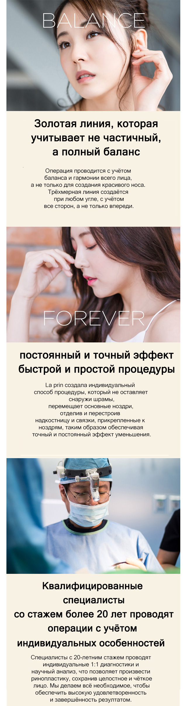 La prin создала индивидуальный способ процедуры, который не оставляет снаружи шрамы, перемещает основные ноздри, отделив и перестроив надкостницу и связки, прикрепленные к ноздрям, таким образом обеспечивая точный и постоянный эффект уменьшения.