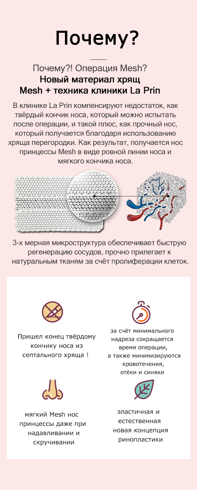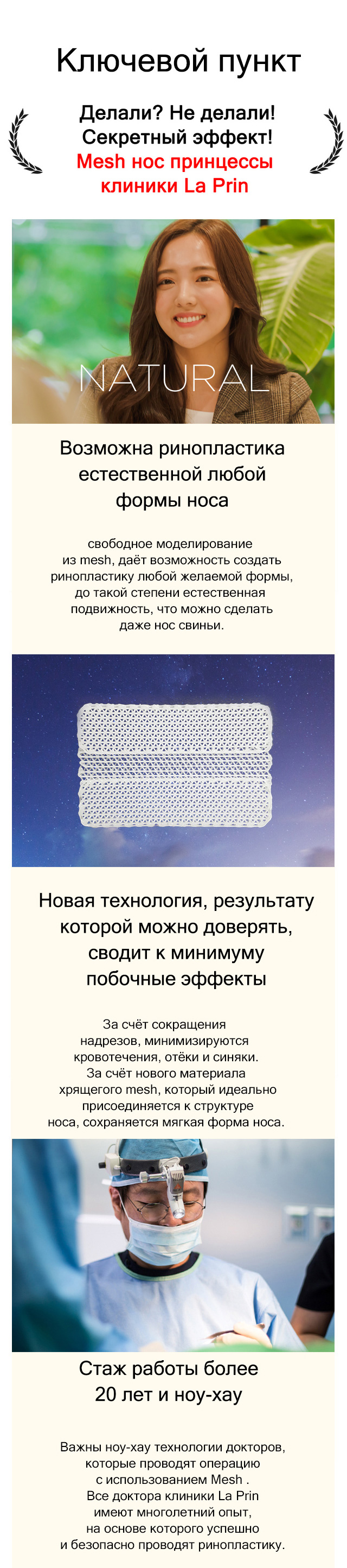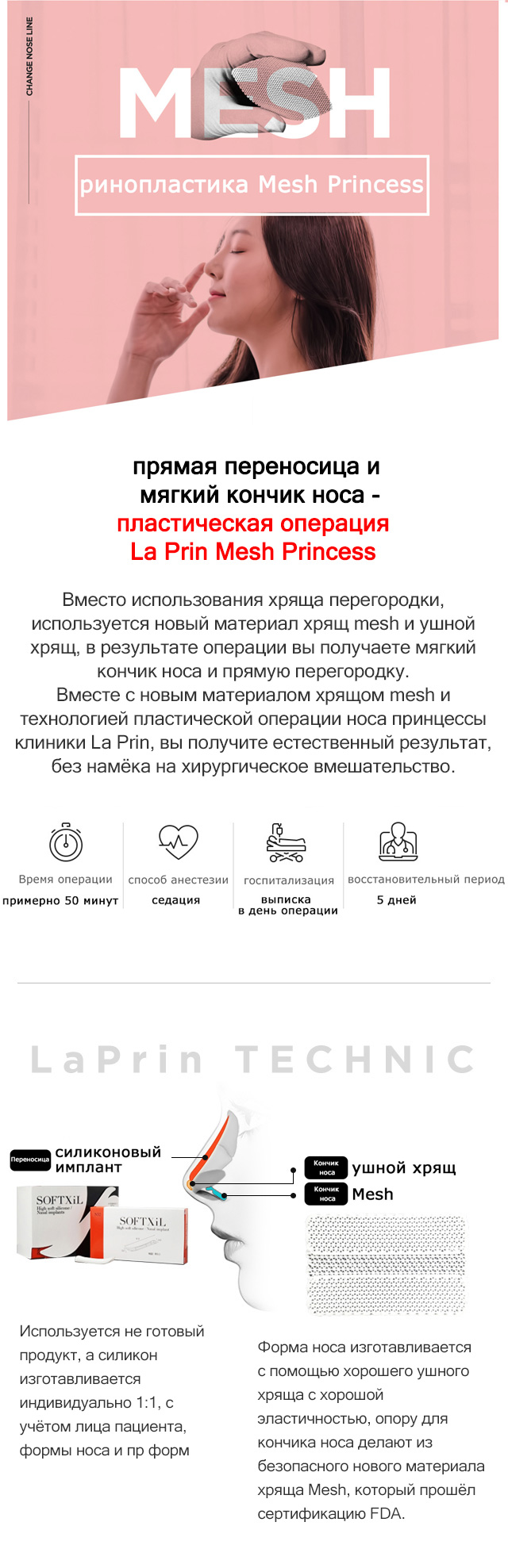 В клинике La Prin компенсируют недостаток, как твёрдый кончик носа, который можно испытать после операции, и такой плюс, как прочный нос, который получается благодаря использованию хряща перегородки. Как результат, получается нос принцессы Mesh в виде ровной линии носа и мягкого кончика носа.