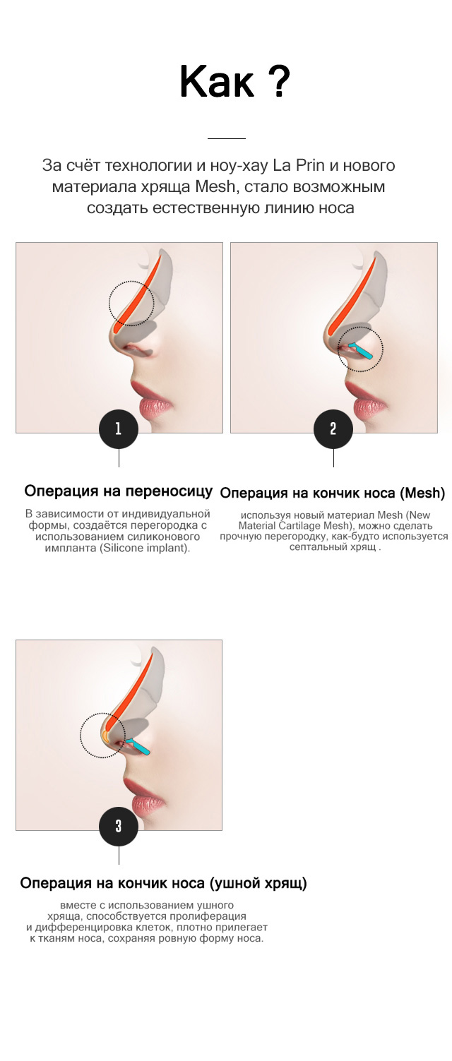 Вместо использования хряща перегородки, используется новый материал хрящ mesh и ушной хрящ, в результате операции вы получаете мягкий кончик носа и прямую перегородку. Вместе с новым материалом хрящом mesh и технологией пластической операции носа принцессы клиники La Prin, вы получите естественный результат, без намёка на хирургическое вмешательство.