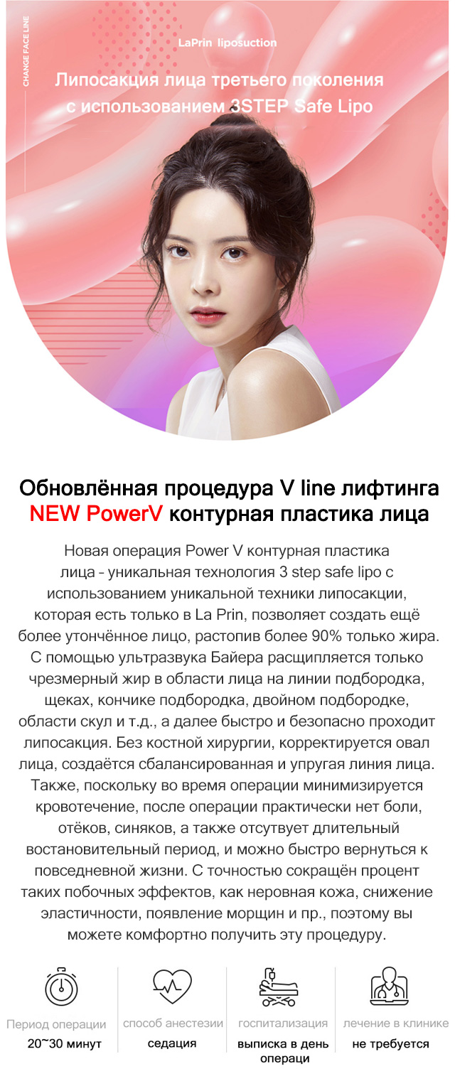 Новая операция Power V контурная пластика лица – уникальная технология 3 step safe lipo с использованием уникальной техники липосакции, которая есть только в La Prin, позволяет создать ещё более утончённое лицо, растопив более 90% только жира. С помощью ультразвука Байера расщипляется только чрезмерный жир в области лица на линии подбородка, щеках, кончике подбородка, двойном подбородке, области скул и т.д., а далее быстро и безопасно проходит липосакция. Без костной хирургии, корректируется овал лица, создаётся сбалансированная и упругая линия лица.