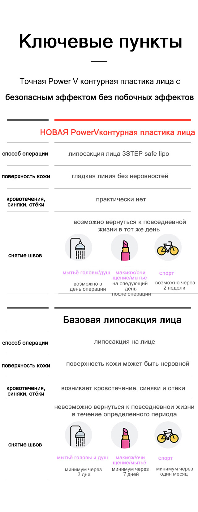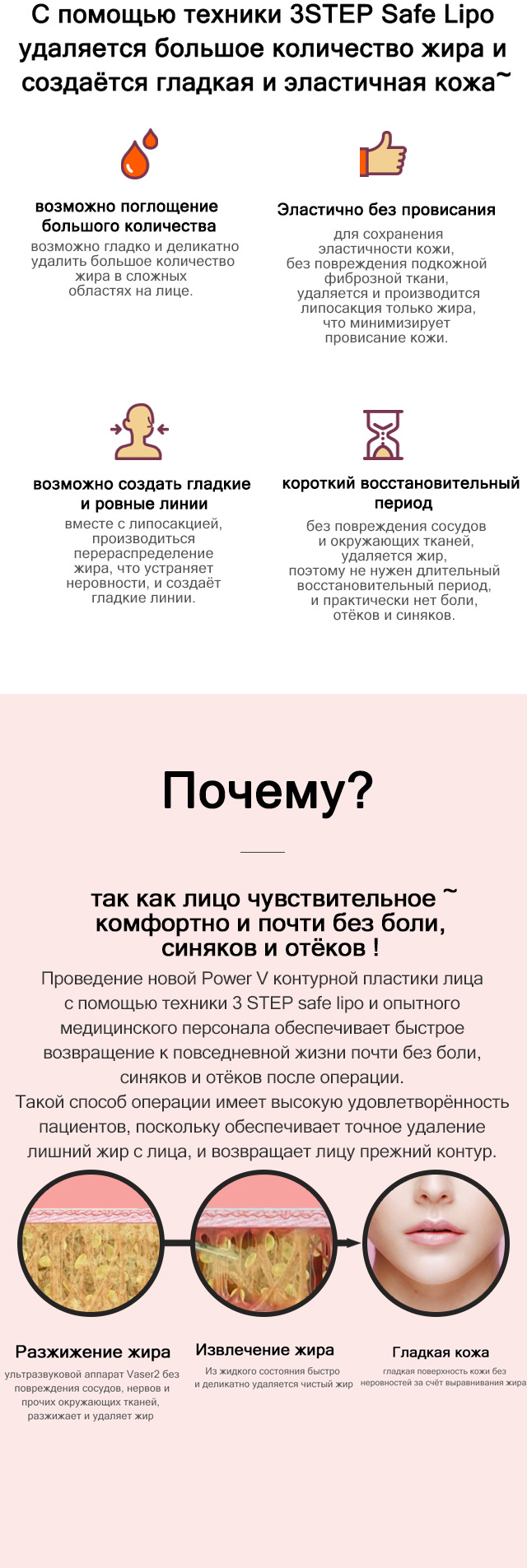Проведение новой Power V контурной пластики лица с помощью техники 3 STEP safe lipo и опытного медицинского персонала обеспечивает быстрое возвращение к повседневной жизни почти без боли, синяков и отёков после операции. Такой способ операции имеет высокую удовлетворённость пациентов, поскольку обеспечивает точное удаление лишний жир с лица, и возвращает лицу прежний контур.