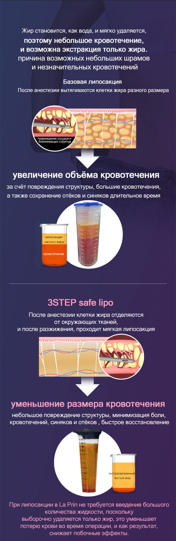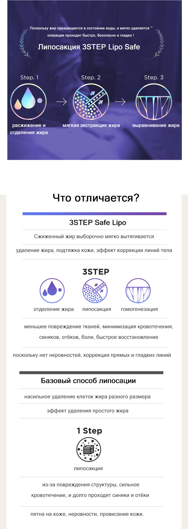 - 3STEP safe lipo -После анестезии клетки жира отделяются от окружающих тканей, и после разжижения, проходит мягкая липосакция > уменьшение размера кровотечения – небольшое повреждение структуры, минимизация боли, кровотечений, синяков и отёков , быстрое восстановление [экстрагированный чистый жир ]