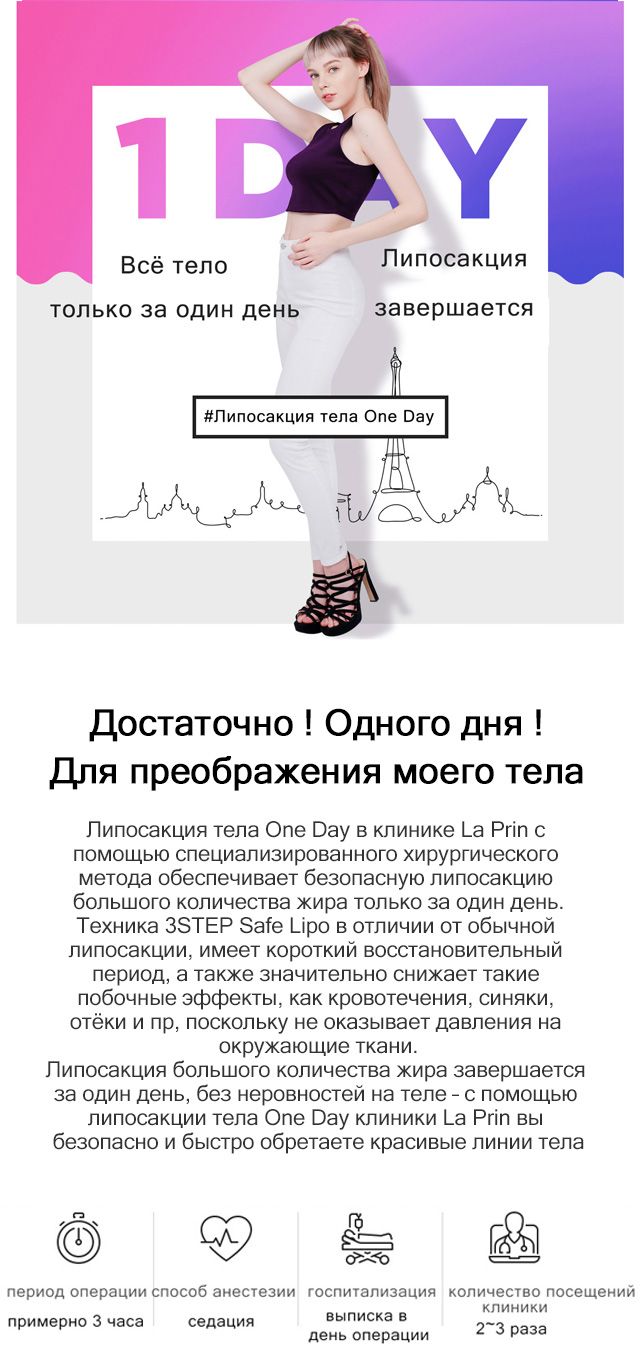 Липосакция тела One Day в клинике La Prin с помощью специализированного хирургического метода обеспечивает безопасную липосакцию большого количества жира только за один день. Липосакция тела One Day в клинике La Prin с помощью специализированного хирургического метода обеспечивает безопасную липосакцию большого количества жира только за один день. Липосакция большого количества жира завершается за один день, без неровностей на теле – с помощью липосакции тела One Day клиники La Prin вы безопасно и быстро обретаете красивые линии тела -
