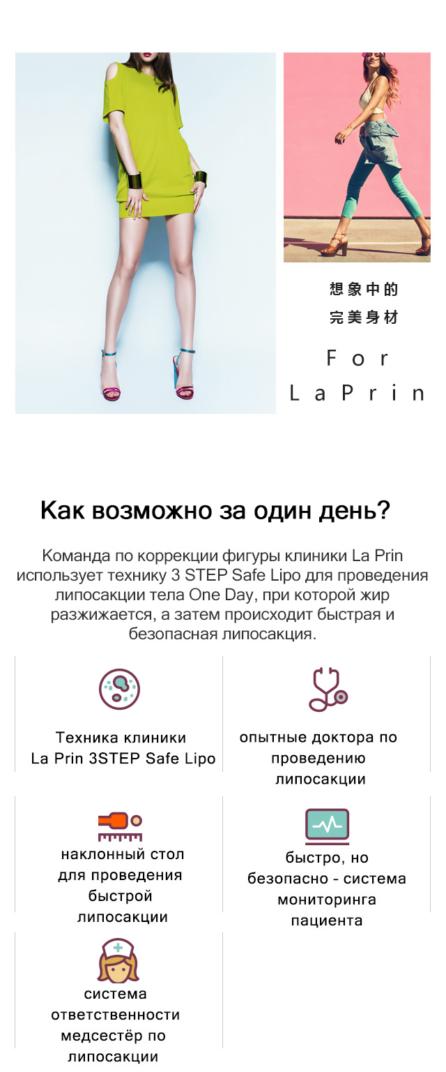 Техника клиники La Prin 3STEP Safe Lipo / опытные доктора по проведению липосакции / наклонный стол для проведения быстрой липосакции / быстро, но безопасно – система мониторинга пациента / система ответственности медсестёр по липосакции