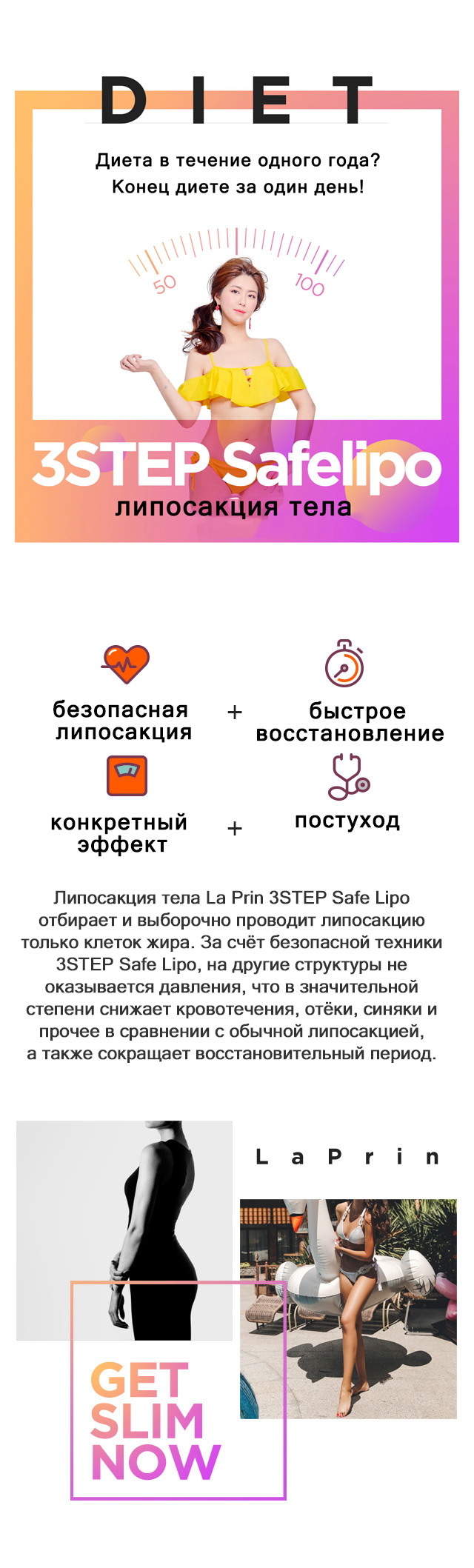 Липосакция тела La Prin 3STEP Safe Lipo отбирает и выборочно проводит липосакцию только клеток жира. За счёт безопасной техники 3STEP Safe Lipo, на другие структуры не оказывается давления, что в значительной степени снижает кровотечения, отёки, синяки и прочее в сравнении с обычной липосакцией, а также сокращает восстановительный период. липосакция большого количества без неровностей – быстрое безопасное завершение линий тела посредством липосакции тела 3STEP Safe Lipo –