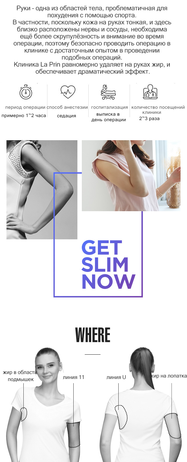 Руки – одна из областей тела, проблематичная для похудения с помощью спорта. В частности, поскольку кожа на руках тонкая, и здесь близко расположены нервы и сосуды, необходима ещё более скрупулёзность и внимание во время операции, поэтому безопасно проводить операцию в клинике с достаточным опытом в проведении подобных операций. Клиника La Prin равномерно удаляет на руках жир, и обеспечивает драматический эффект.