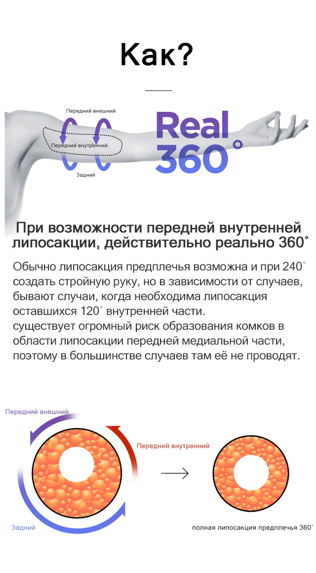 Обычно липосакция предплечья возможна и при 240˚ создать стройную руку, но в зависимости от случаев, бывают случаи, когда необходима липосакция оставшихся 120˚ внутренней части. существует огромный риск образования комков в области липосакции передней медиальной части, поэтому в большинстве случаев там её не проводят. Однако, La Prin Real 360˚ липосакция предплечья использует технику 3STEP safe lipo, когда возможно без побочных эффектов безопасно и гладко удалить жир. [полная липосакция предплечья 360˚]
