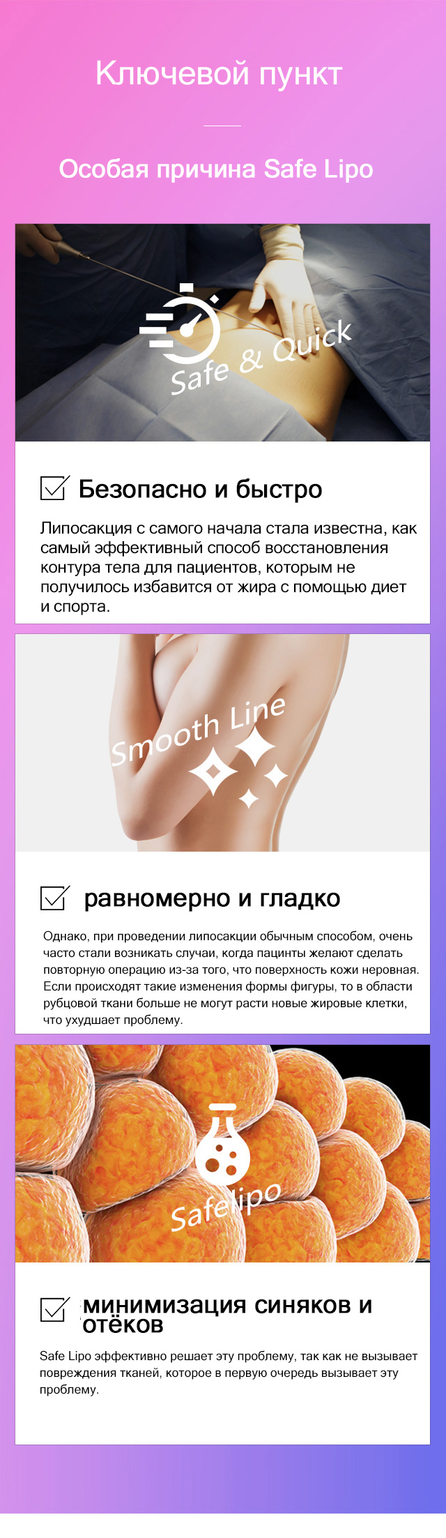 Минимизация кровотечения и побочных эффектов за счёт технологии 3STEP Safe Lipo ! Нет необходимости переживать за липосакцию и больших объёмов !