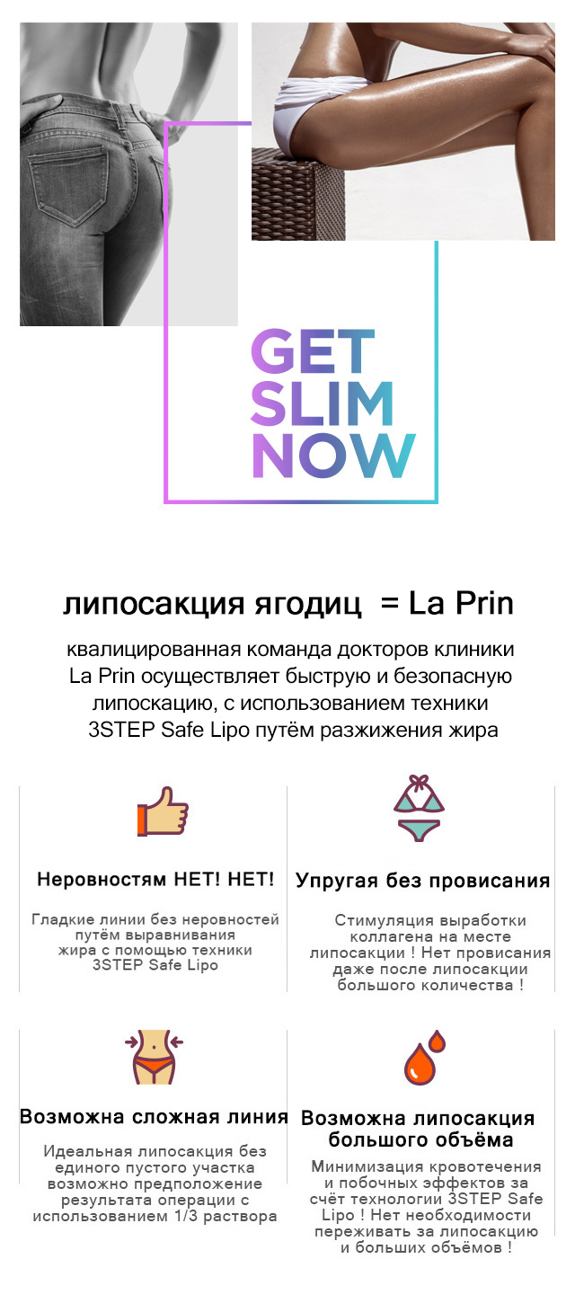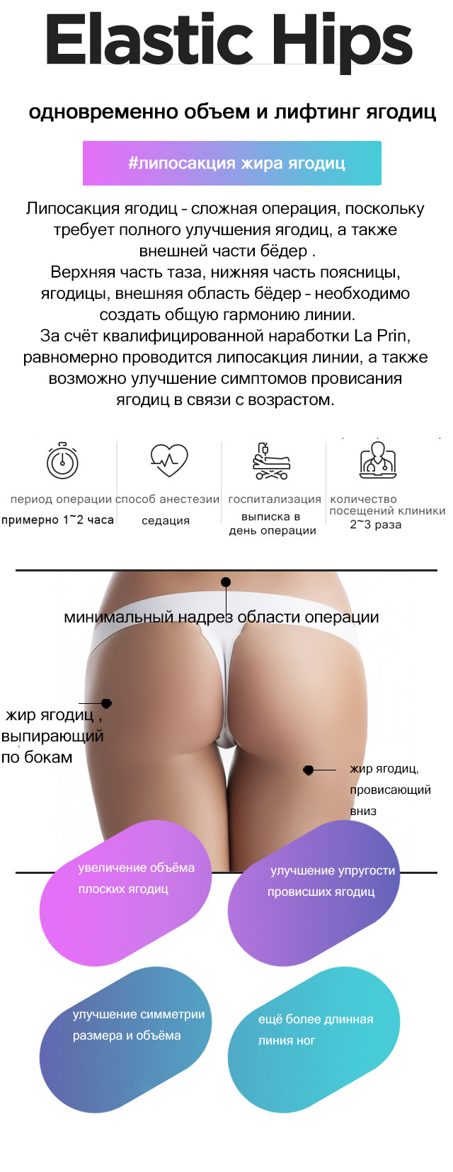 Липосакция ягодиц – сложная операция, поскольку требует полного улучшения ягодиц, а также внешней части бёдер . Верхняя часть таза, нижняя часть поясницы, ягодицы, внешняя область бёдер – необходимо создать общую гармонию линии. За счёт квалифицированной наработки La Prin, равномерно проводится липосакция линии, а также возможно улучшение симптомов провисания ягодиц в связи с возрастом.