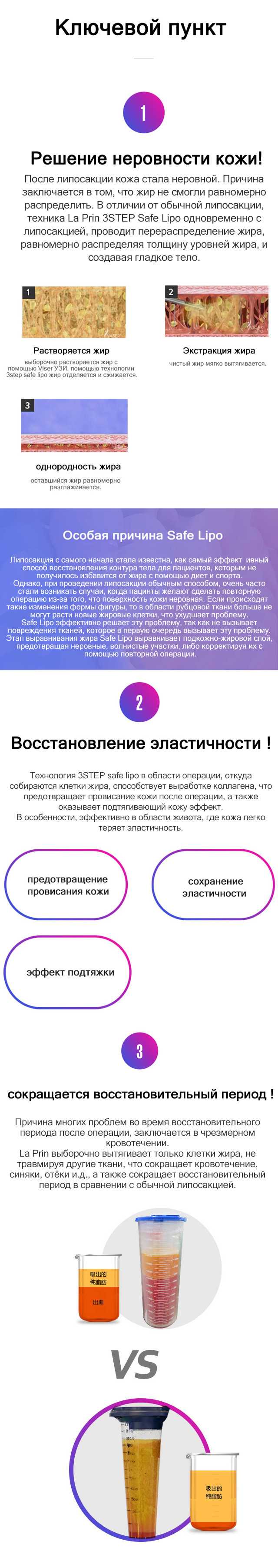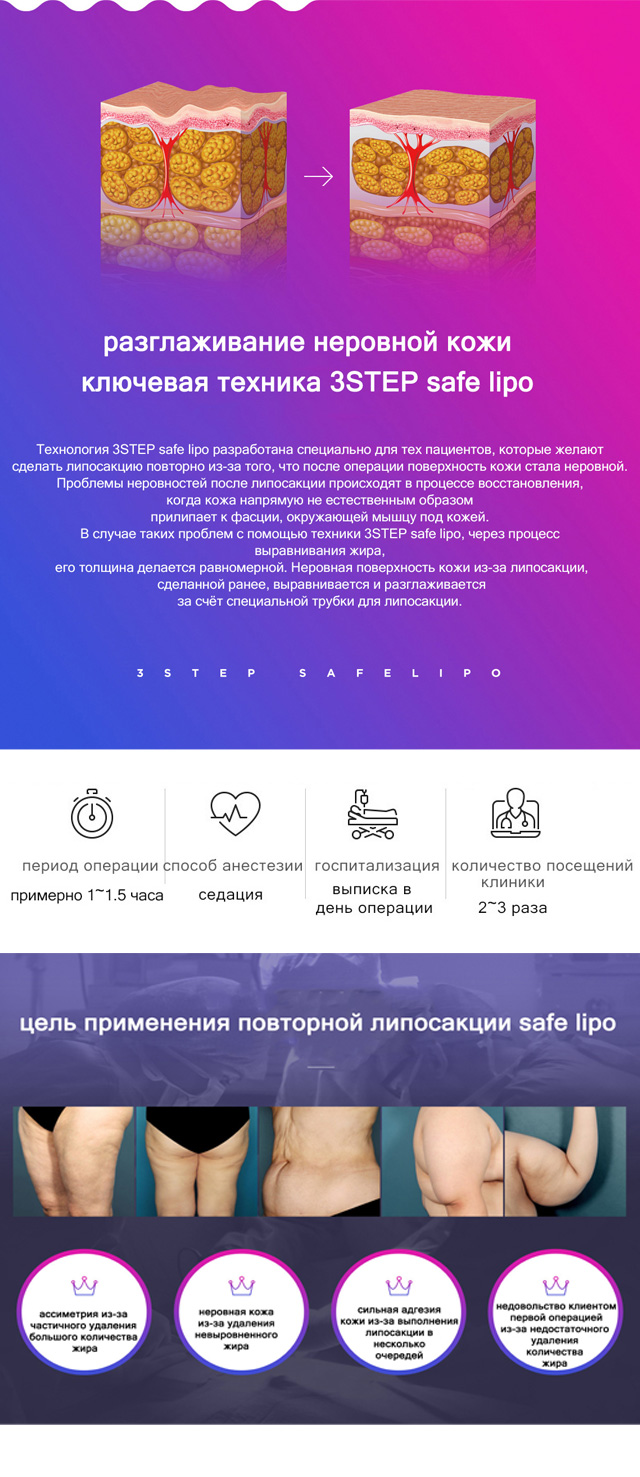 Технология 3STEP safe lipo разработана специально для тех пациентов, которые желают сделать липосакцию повторно из-за того, что после операции поверхность кожи стала неровной.